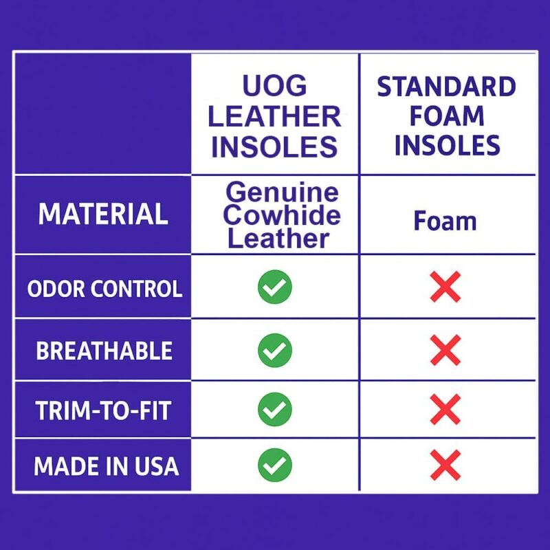 Because real comfort begins with real materials. Unlike mass-produced insoles made from PU or PVC that trap heat and fall apart, UOG delivers authentic leather comfort and American craftsmanship—designed to last, step after step.