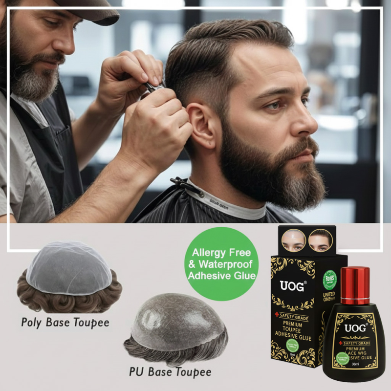 The UOG Toupee Adhesive Glue is designed for poly & PU base hairpieces, lace wigs, and hair replacement systems, providing a strong, waterproof, and reliable hold. With its quick-dry and allergy-free formula, this adhesive ensures a seamless and natural look while being gentle on the skin.